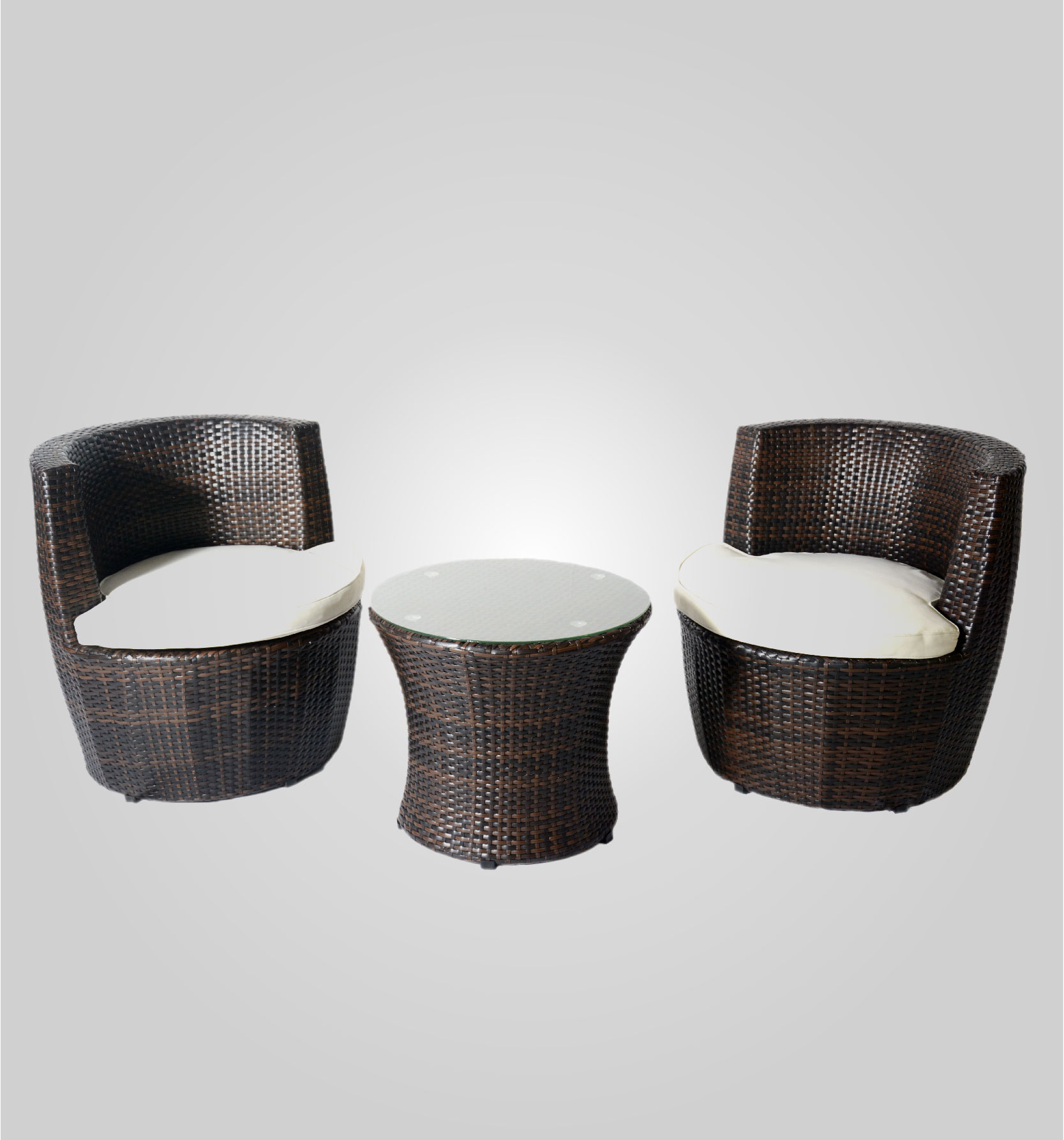Medidas: 58 cm de diámetro x 48 cm de alto, la mesa. 71 cm de diámetro x 73 cm de alto, cada sillón.