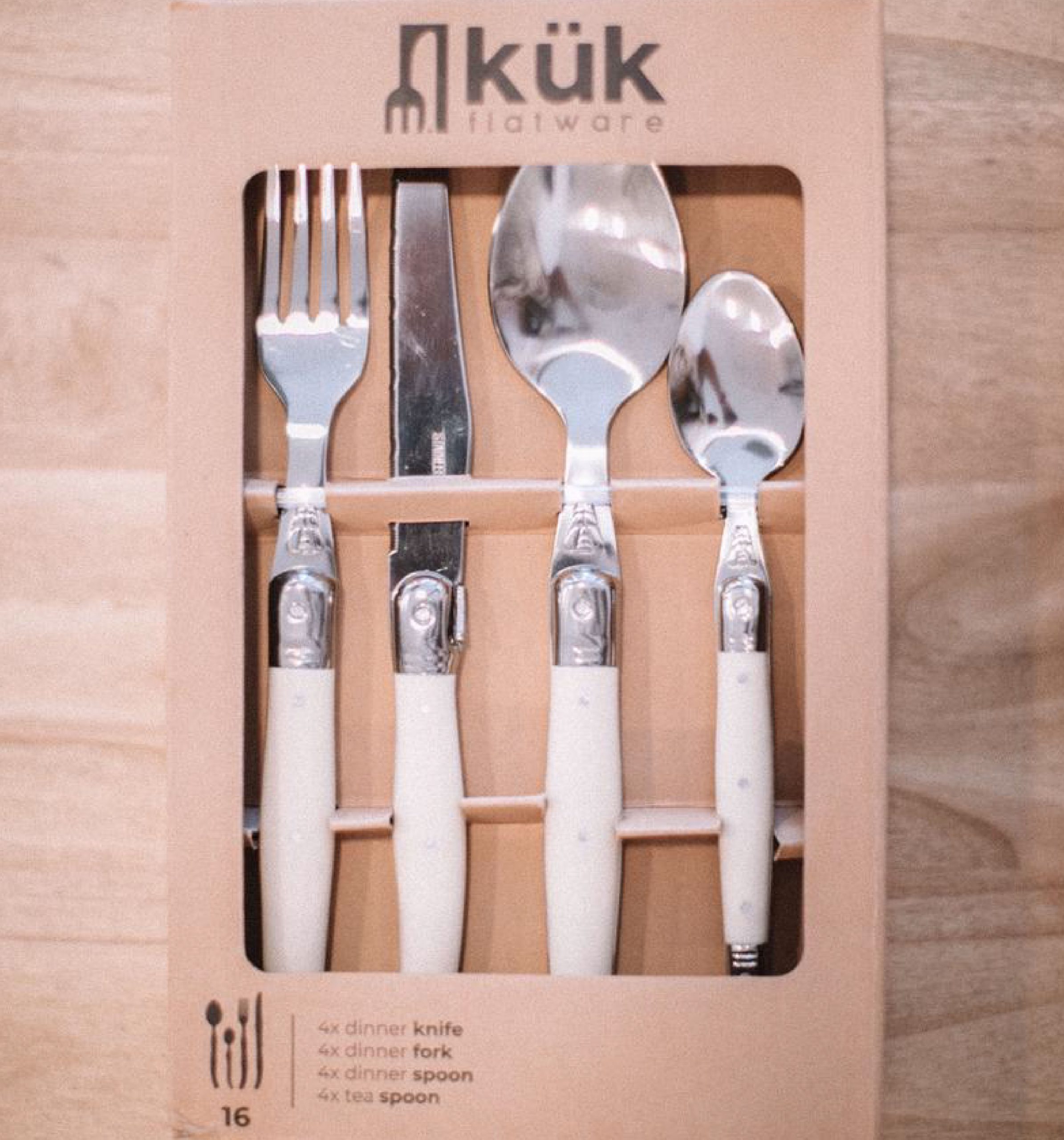 El set es para 4 comensales, incluye: 4 tenedores, 4 cuchillos, 4 cucharas soperas, 4 cucharas de postre.