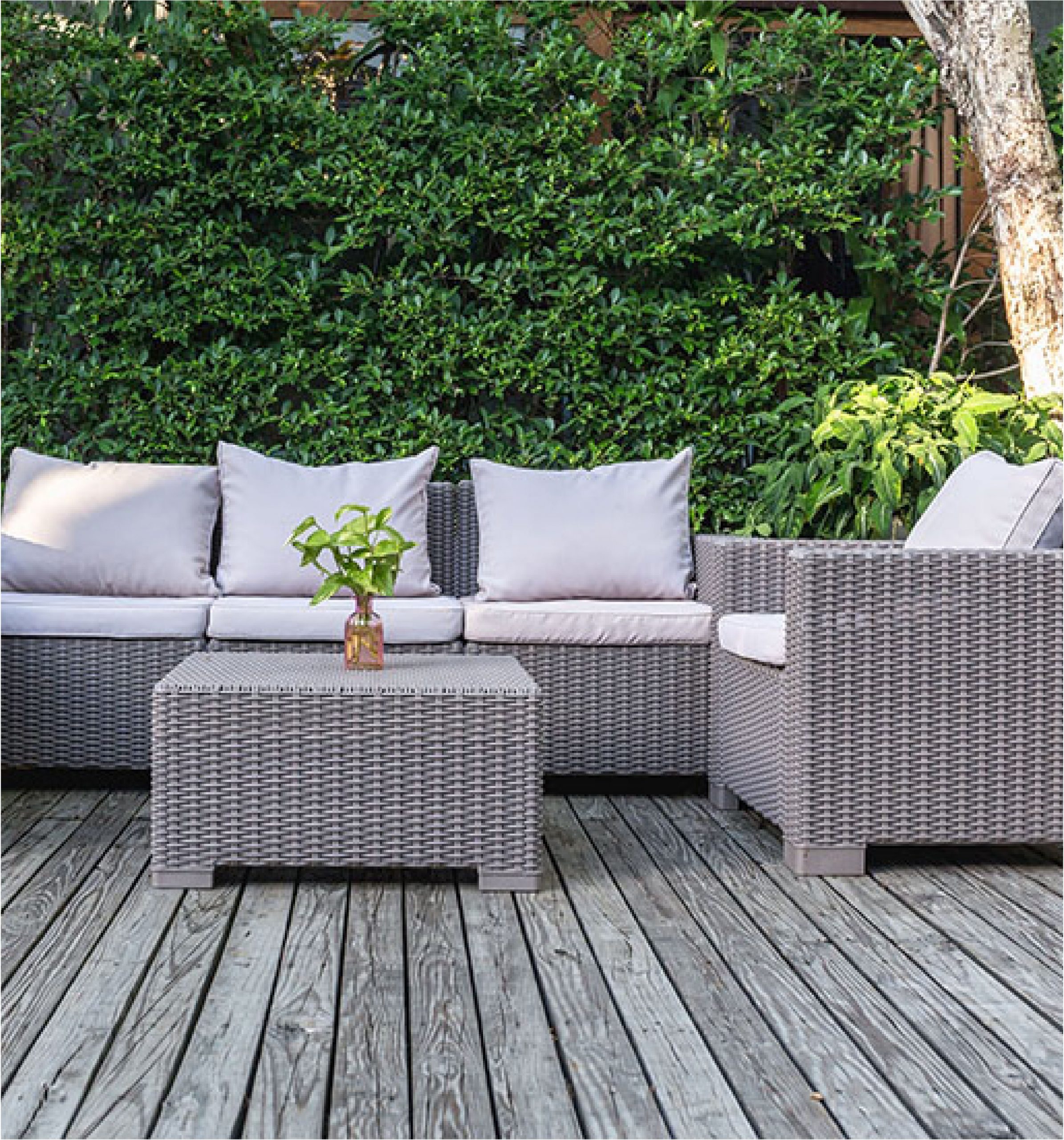 – Set diana: 1 Sillón triple + 2 sillones individuales + 1 mesa con almohadones claros. Todos los sillones en color gris.